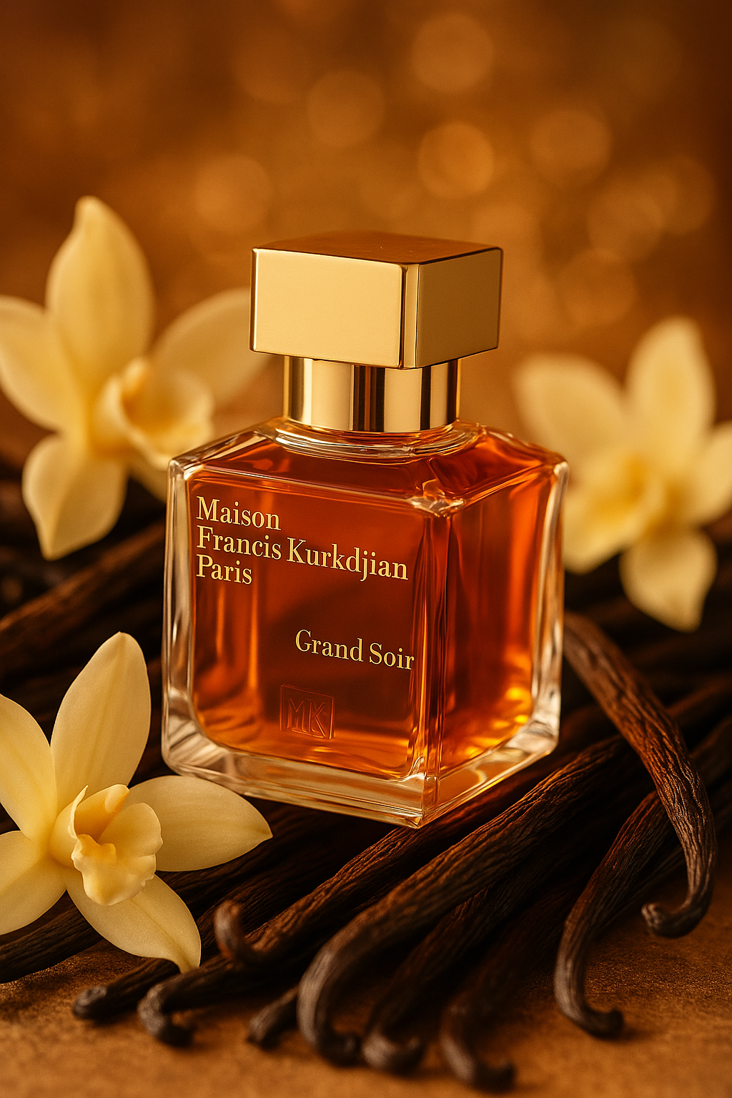 Grand Soir-parfymen fanget i en stemningsfull komposisjon med delikate vaniljestenger. Filmatic Media fremhever dine produkter med kreativitet og kvalitet.