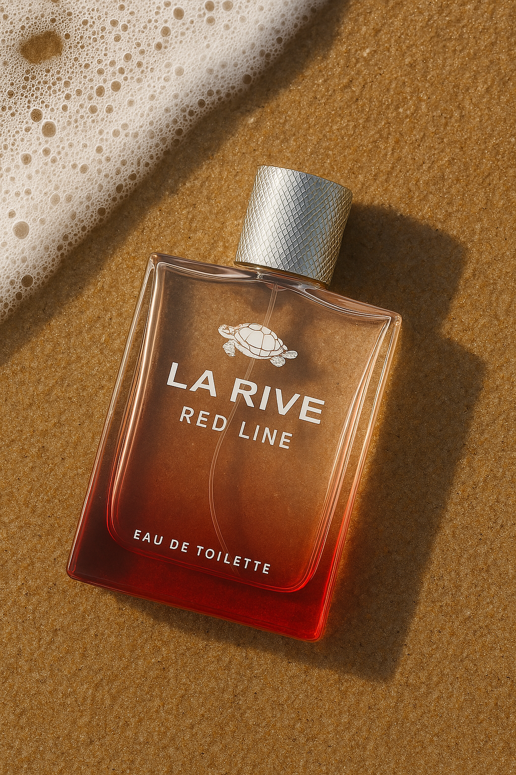 Produktfoto av La Rive-parfymen plassert i sanden langs vannkanten. Filmatic Media fremhever dine produkter i unike miljøer som gir oppmerksomhet og stil.